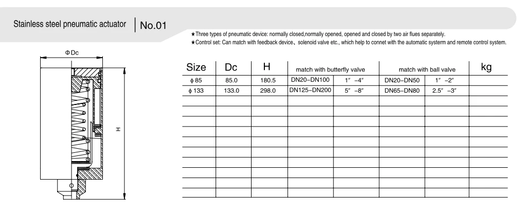 - Ενεργοποιητής μονής δράσης: Εξοπλισμένος με λειτουργία επαναφοράς ελατηρίου, επιστρέφει αυτόματα στην αρχική του θέση σε περίπτωση διακοπής παροχής αέρα, προσφέροντας υψηλή προστασία ασφαλείας και κατάλληλος για σενάρια με υψηλές απαιτήσεις ασφάλειας.